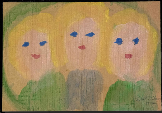 “Three Ladies” dated 1992 by Sybil Gibson paint on cardboard ply 13.5″ x 19.75″ in gold frame 21.5″ x 27.5″ $1100 #13776