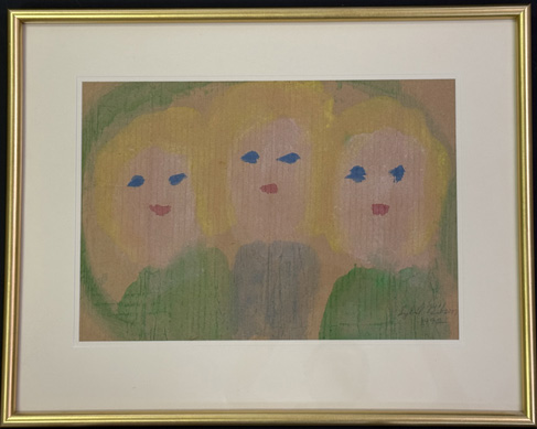 framed “Three Ladies” dated 1992 by Sybil Gibson paint on cardboard ply 13.5″ x 19.75″ in gold frame 21.5″ x 27.5″ $1100 #13776