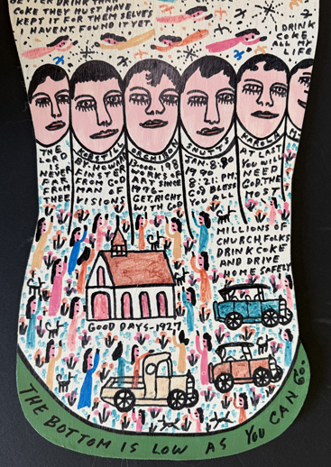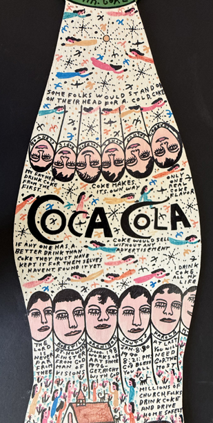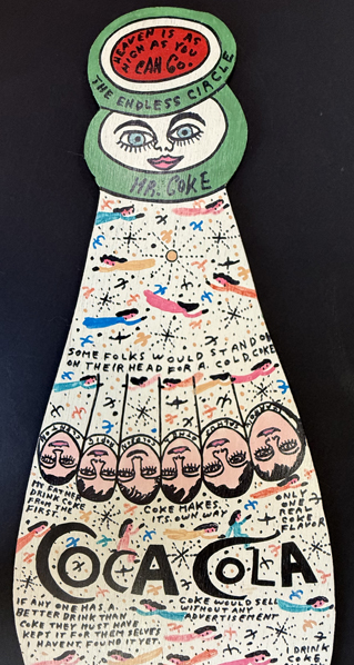 detail bottom “Coke Bottle” #13,198 dated Jan 8, 1990 by Howard Finster paint, marker on wooden cut out 34″ x 10.5″ x 1/4″ $4000