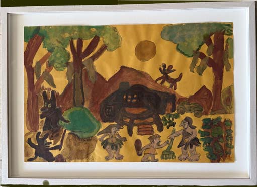 detail “The Flintstones” c. 1984 by Juanita Rogers watercolor on colored paper 12.5″ x 19″ black mat & frame $1200 #10043