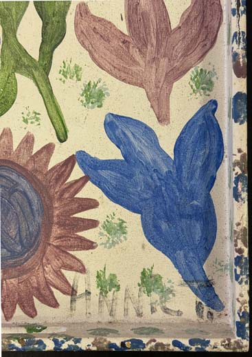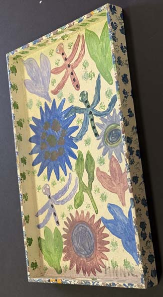 side of tray “Butterfly Leaving a Flower” dated 4-13-01 by Annie Tolliver acrylic house paint on wooden tray 20″ x 12″ x 1.75″ $1300 #13777