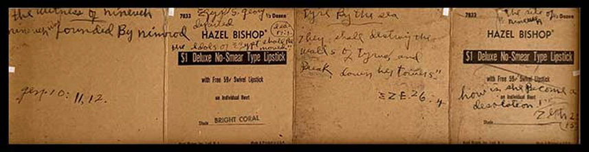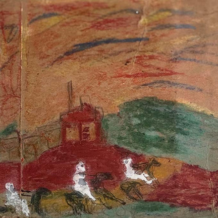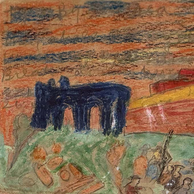 detail “Egypt’s Glory Departed” c. 1959-61 by Sister Gertrude Morgan, pencil over crayon on cardboard lipstick box, ink on verso, 5″ x 21.25″ wide white linen mat with carved wooden frame 17″ x 32.5″, $39,000, Provenance Larry Borenstein, #13732