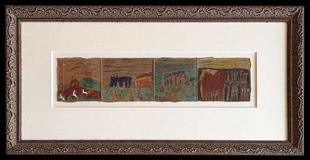 Framed “Egypt’s Glory Departed” c. 1959-61 by Sister Gertrude Morgan, pencil over crayon on cardboard lipstick box, ink on verso, 5″ x 21.25″ wide white linen mat with carved wooden frame 17″ x 32.5″, $39,000, Provenance Larry Borenstein, #13732
