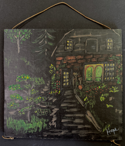 “Magical Midnight house” dated 1990 by Hope Atkinson acrylic on cardboard 8.25″ x 8.75 $300 #13736