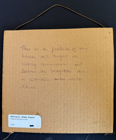Verso “Magical Midnight house” dated 1990 by Hope Atkinson acrylic on cardboard 8.25″ x 8.75 $300 #13736