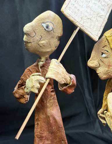 detail brown figure “Three Wisemen–Fools” c. 1991 by Hope Atkinson (3 figures with two signs)papier mache & paint with found metal spring tallest figure 7″ $1400 #13734