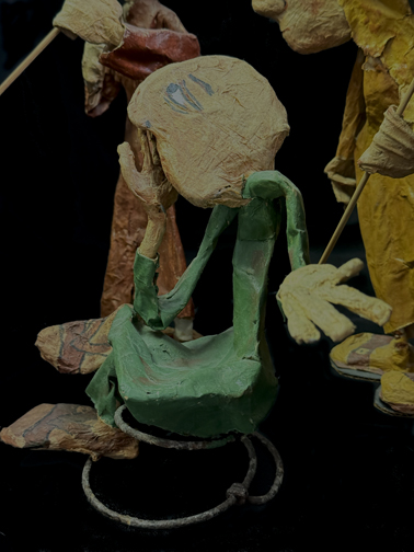 detail green figure “Three Wisemen–Fools” c. 1991 by Hope Atkinson (3 figures with two signs)papier mache & paint with found metal spring tallest figure 7″ $1400 #13734