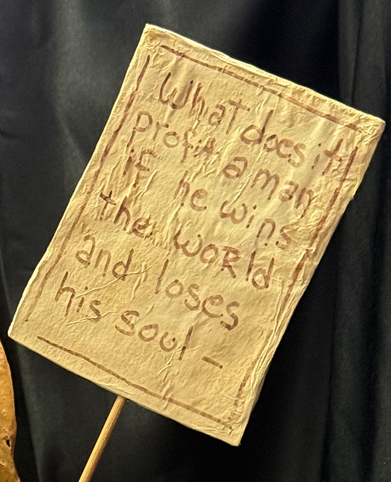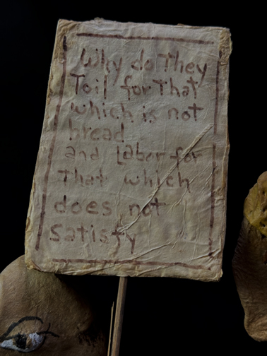 sign of brown figure “Three Wisemen–Fools” c. 1991 by Hope Atkinson (3 figures with two signs)papier mache & paint with found metal spring tallest figure 7″ $1400 #13734